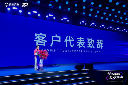 礼乐毕,统帅装饰集团董事长杨海登台发表演讲。他动情回忆,二十年前,他从桐城只身来到上海创业,守着一份初心一路打拼,如今企业已巍然立足上海,他感恩时代和国家赋予、感谢员工一路的同行、客户的信任、合作伙伴的支持,特别提及创业初期风雨同舟的老员工群体,现场掌声经久不息。